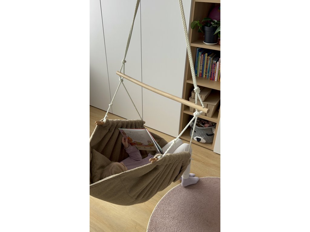 Rastúce závesné kreslo v kolekcii WOLLY sa prispôsobí potrebám vašich detí – jednoduchým presunutím lana na drevených tyčiach môžete meniť polohu na sedenie, ležanie.